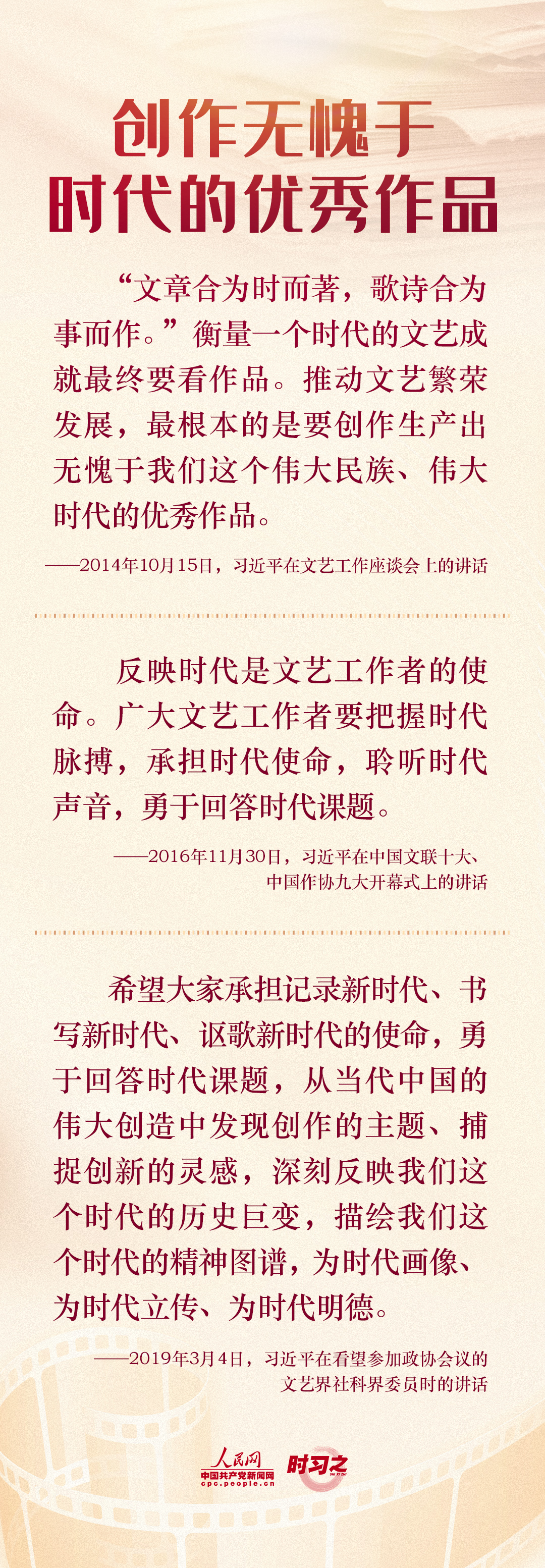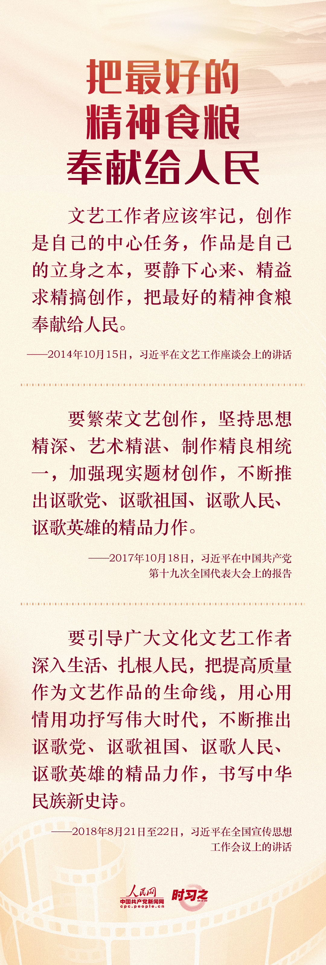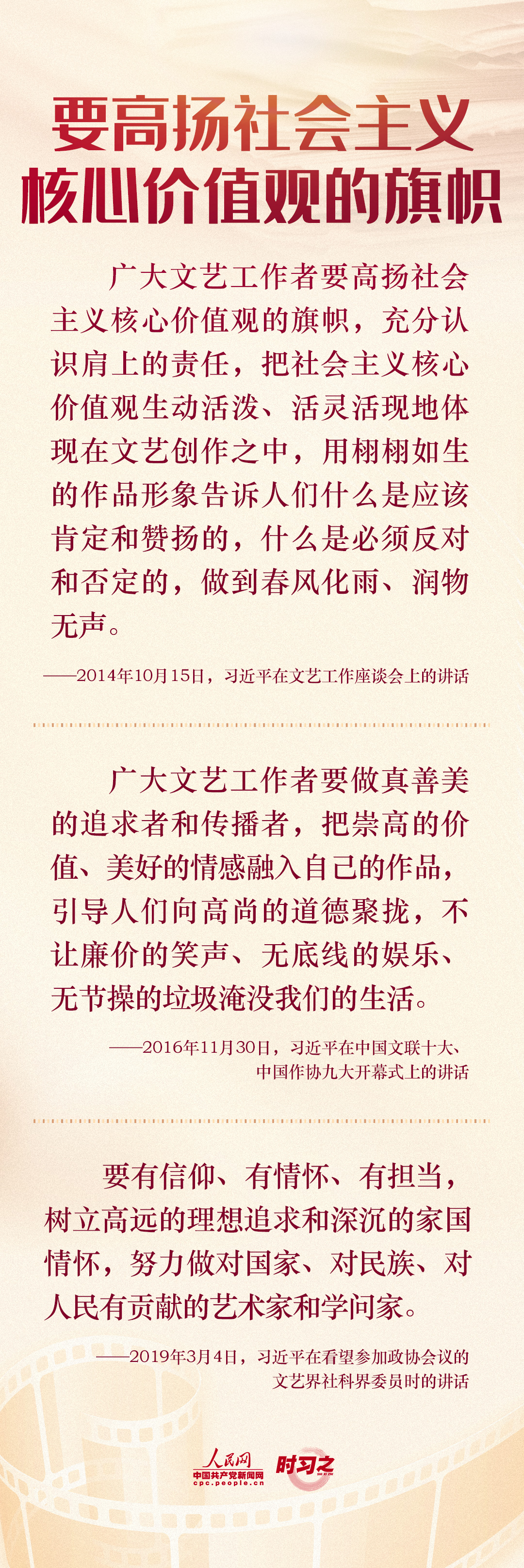 2014年10月15日,习近平总书记主持召开文艺工作座谈会并发表重要讲话,深刻阐述了文艺和文艺工作的地位作用和重大使命,强调“文艺是铸造灵魂的工程,文艺工作者是灵魂的工程师”。七年来,就做好“培根铸魂”工作,习近平多次作出重要论述。