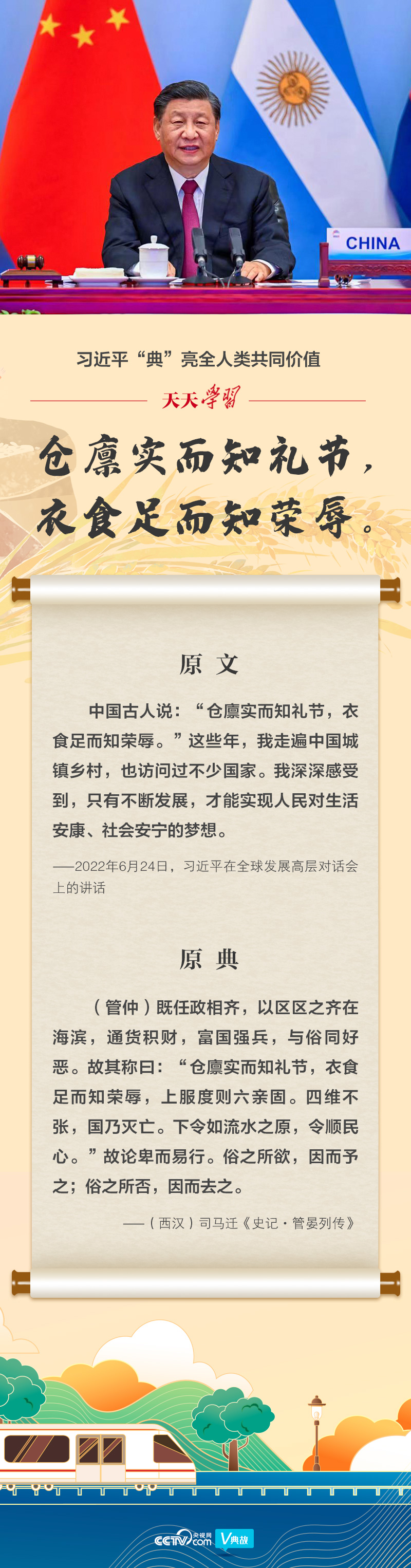 在全球发展高层对话会上的讲话第二段,习近平主席引用中国古代哲人的话“仓廪实而知礼节,衣食足而知荣辱”,阐述物质文明建设与精神文明建设的关系,并用亲身经历畅谈感想:“这些年,我走遍中国城镇乡村,也访问过不少国家。我深深感受到,只有不断发展,才能实现人民对生活安康、社会安宁的梦想。”