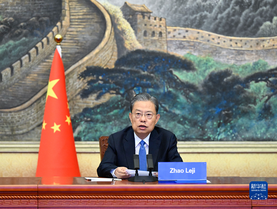 5月26日下午,全国人大常委会委员长赵乐际在北京人民大会堂以视频方式同冰岛议长奥尔曼松举行会谈。