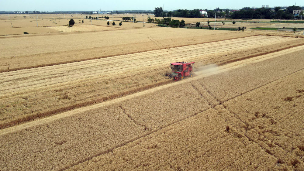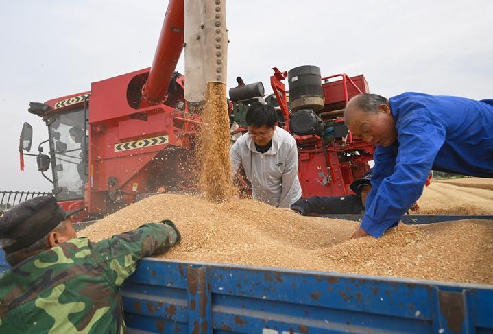 麦收时节,在安徽阜阳太和县,机器轰鸣,麦浪翻滚如金色绸缎,饱满的麦粒装满一辆辆运粮车的货厢。