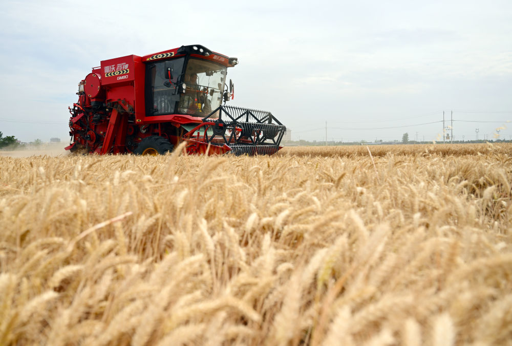 2024年5月29日,在太和县淙祥现代农业种植专业合作社,农机手操作机械设备收割小麦。