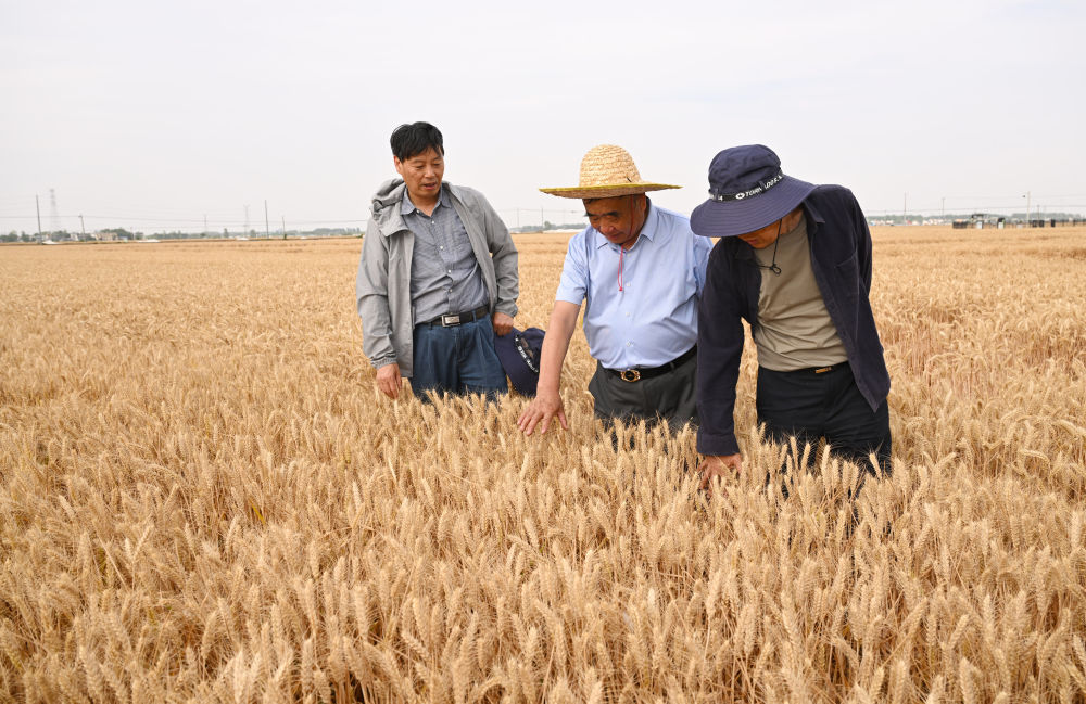 2024年5月29日,在太和县淙祥现代农业种植专业合作社,徐淙祥(中)和农技专家一起为试验麦种测产。