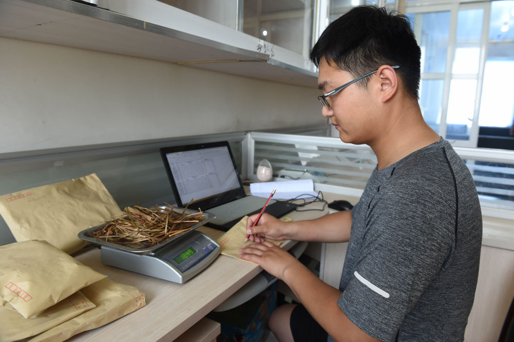 2022年6月28日,在太和县淙祥现代农业种植专业合作社,徐旭东在实验室对农作物样品进行称重和记录。