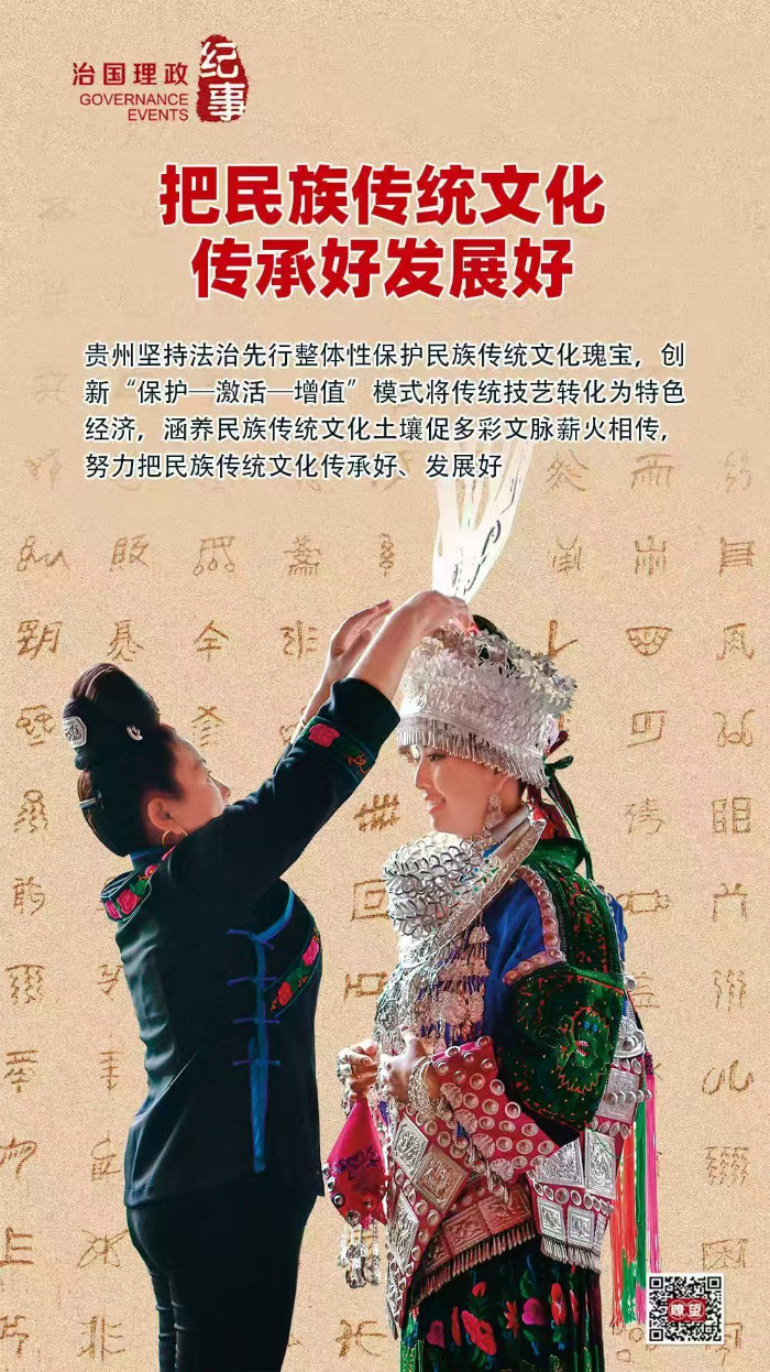 ◇贵州坚持法治先行整体性保护民族传统文化瑰宝,创新“保护—激活—增值”模式将传统技艺转化为特色经济,涵养民族传统文化土壤促多彩文脉薪火相传,努力把民族传统文化传承好、发展好。