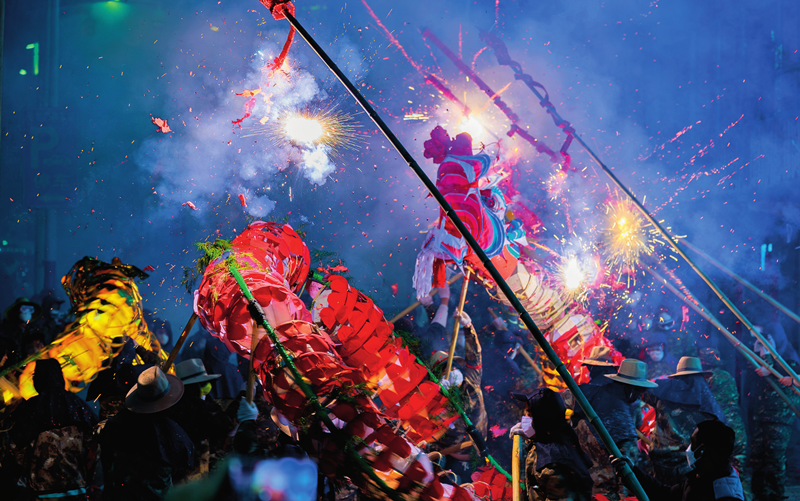 在贵州省施秉县,人们在舞龙队伍经过时进行“炸龙”活动(2025年2月6日摄)刘续摄/本刊