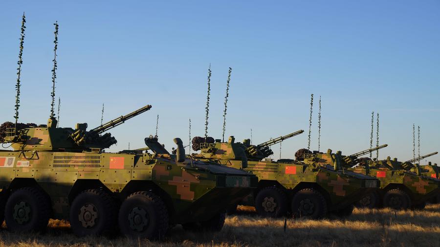 2021年9月20日,在俄罗斯奥伦堡州东古兹靶场举行的“和平使命-2021”上海合作组织联合反恐军事演习开幕式上,中方参演部队接受检阅。新华社记者 梅世雄 摄