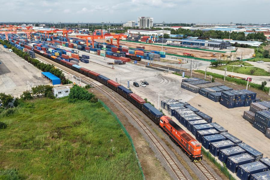 8月27日,一列货运列车驶入位于上合示范区内的中国-上海合作组织地方经贸合作示范区多式联运中心(无人机照片)。新华社记者 李紫恒 摄