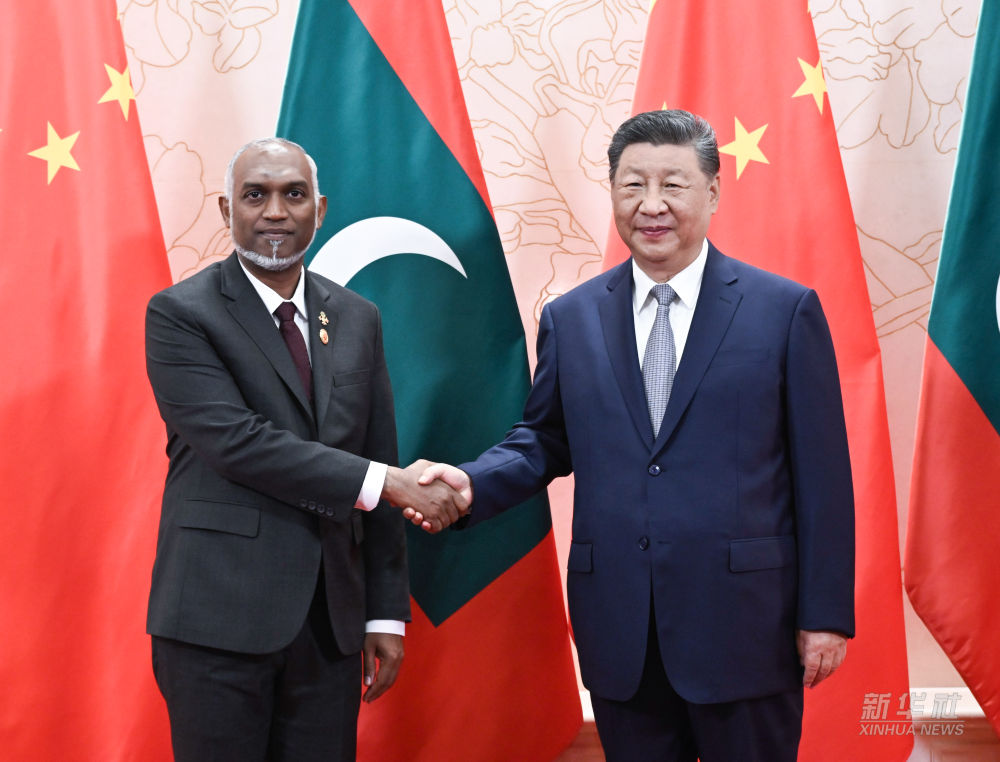 8月31日上午,国家主席习近平在天津迎宾馆会见来华出席2025年上海合作组织峰会和纪念中国人民抗日战争暨世界反法西斯战争胜利80周年活动的马尔代夫总统穆伊兹。