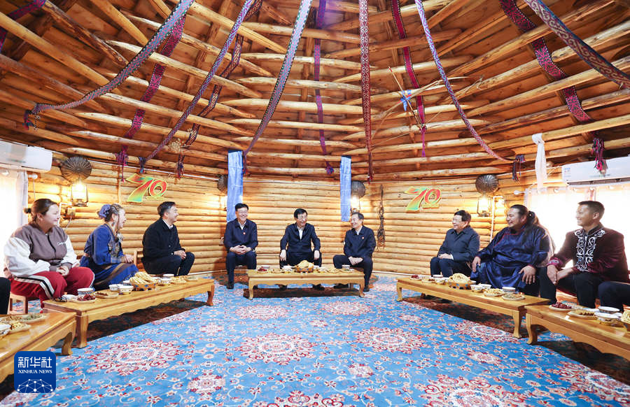 9月27日,受习近平总书记嘱托,中共中央政治局常委、全国政协主席、中央代表团团长王沪宁带领中央代表团部分成员到阿勒泰地区布尔津县考察。这是王沪宁和中央代表团部分成员在扎拉特乡村旅游专业合作社同村民交流。