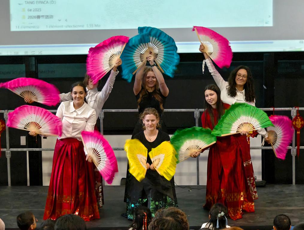 2月5日,在法国马诺斯克,普罗旺斯-阿尔卑斯-蓝色海岸大区国际学校学生在春节活动上表演。新华社发(普罗旺斯-阿尔卑斯-蓝色海岸大区国际学校供图)