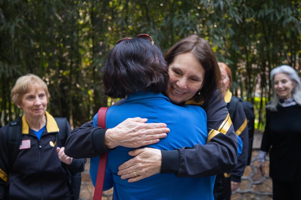 4月8日,在北京大学,美方“乒乓外交”亲历者朱迪·霍尔弗罗斯特与中方亲历者郑敏之在重逢时热情拥抱。北京大学供图