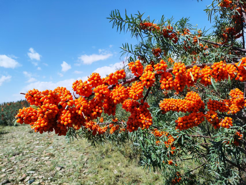 解决了灌溉难题,“空守一条大河而受穷”的历史得以改写。华能持续投入,加强育苗、林间管理、防病虫害工作,库兰萨日克乡在华能驻村工作队的帮助下,应用管网灌溉技术率先建成万亩沙棘林。几年下来,人进沙退、水来果熟,迎风而立的沙棘林逐步形成一道防风固沙的生态屏障,更成为了助力群众增收致富的“幸福林”。