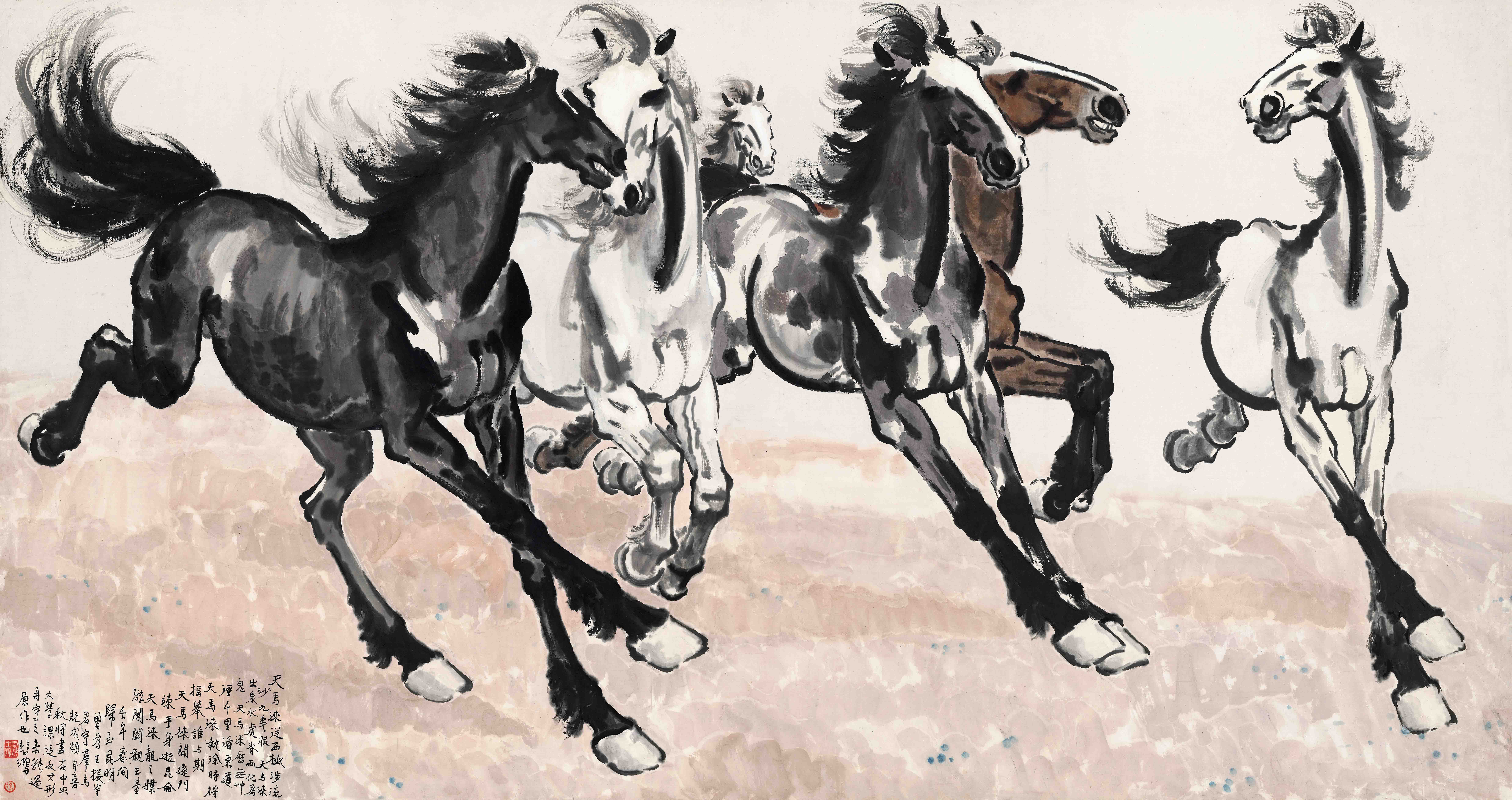 北京保利推出的徐悲鸿《天马六骏》以7800万元成交。徐悲鸿笔下的骏马融合了西方古典主义与中国传统的审美标准与趣味。此幅《天马六骏》达15平尺,是目前可知的唯一一幅珍藏于民间的徐悲鸿巨幅画马作品。