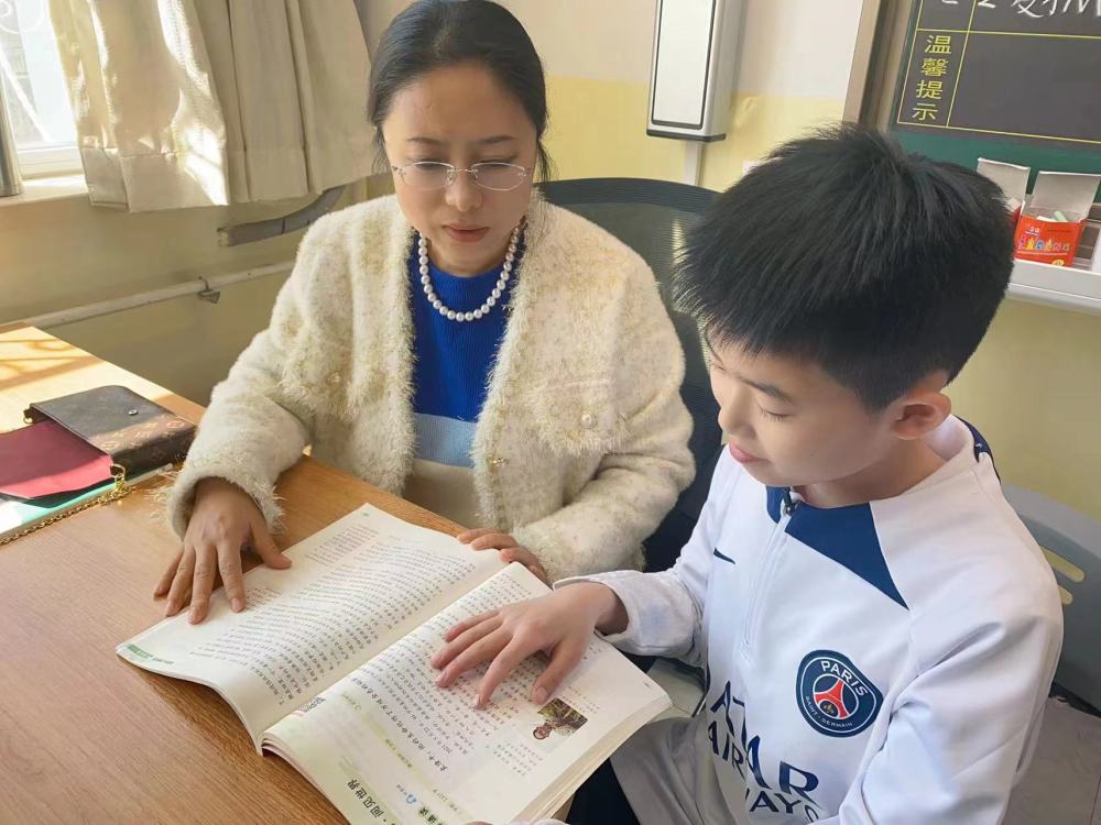 小作者和赵晓京老师一起学习《我们的语文》。(张石榴 摄)
