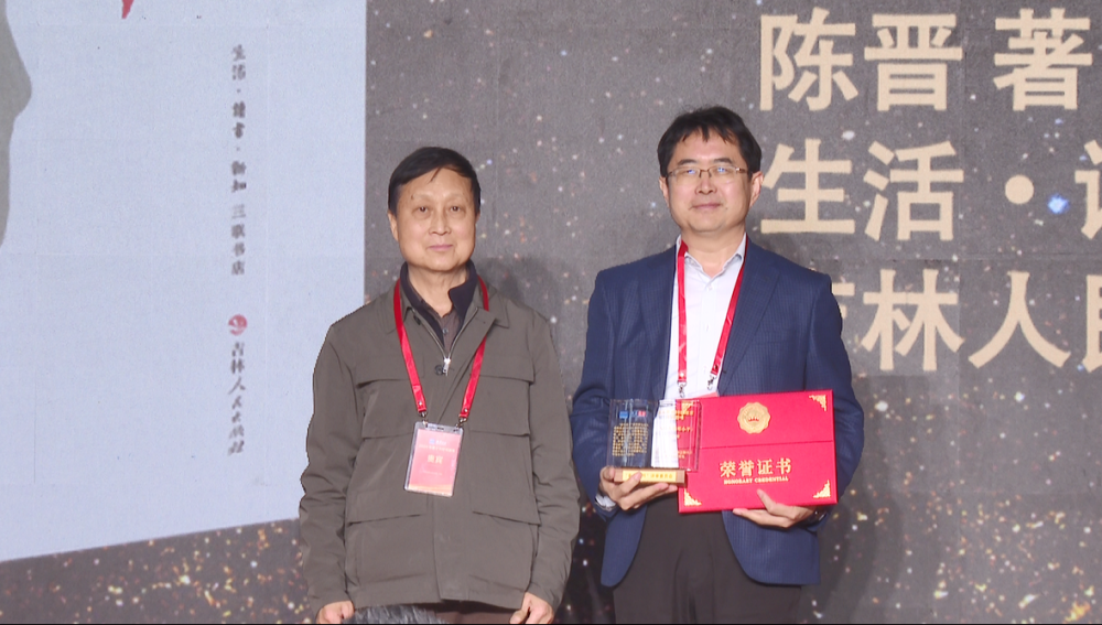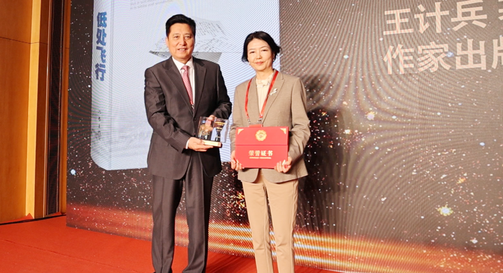中央文史研究馆馆员、茅盾文学奖获得者张平(左)向人民邮电出版社执行董事、总经理李文颁发奖杯与证书