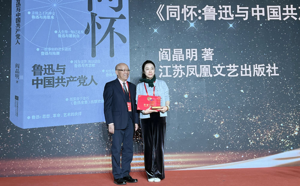 新华社原副社长兼常务副总编辑马胜荣(左)向江苏凤凰文艺出版社总编辑赵阳颁发奖杯与证书