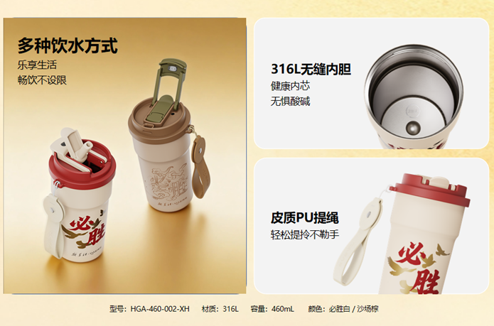 “必胜”系列围绕办公、出行、运动等全场景需求,以精湛工艺与贴心设计打造三款产品,全方位覆盖不同人群的使用需求。其中,全能咖啡杯搭载460mL黄金容量与287g轻量化设计,推出必胜白、沙场棕双色选择。该产品创新采用吸管口、直饮口、畅饮口三重设计,咖啡、花茶、清水等饮品皆可随心适配;内置316L不锈钢一体成型内胆,具备出色的耐酸碱抗腐蚀性能,且实现6小时保热、保冷的稳定温控,让清晨的热咖啡与午后的冰美式始终保持绝佳口感;360°密封防漏设计搭配柔软舒适的皮质PU拎绳,装包不担心渗漏湿袋,指尖轻勾即可开启惬意出行。