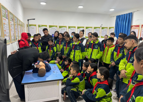 图为当地公众和学生在木尕拉镇乡镇科普馆学习急救知识