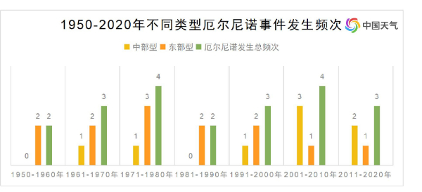 1950-2020年不同类型厄尔尼诺事件发生频次