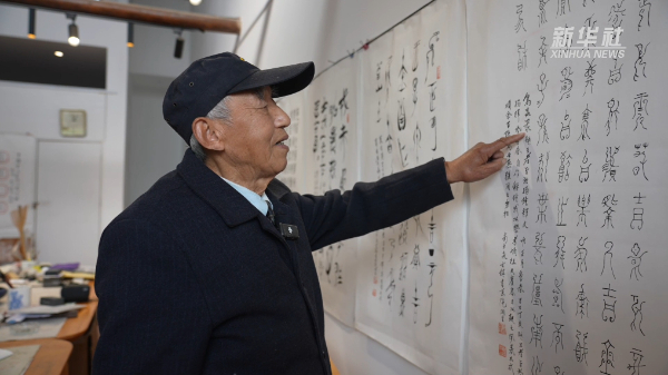 每天清晨,他骑着自行车,来到工作室,开始一天的文字研究。他笑着说,听音乐、学古字、练书法,也是他健康快乐的秘诀。