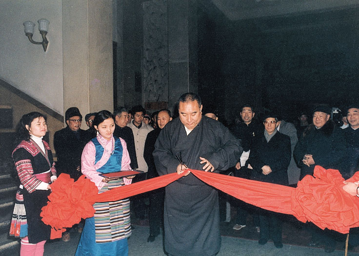 1987年《石愚画展》在北京举行,全国人大原副委员班禅为画展开幕剪裁。