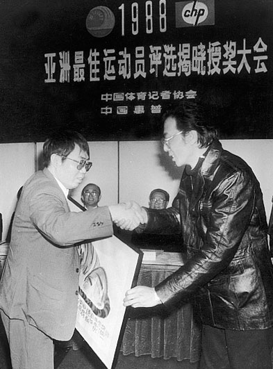 1988年在亚洲最佳运动员评选揭晓授奖大会上为棋圣聂卫平颁奖。