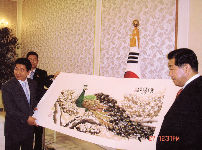 2004年9月,全国政协主席贾庆林访问韩国。石愚的国画作品《吉祥图》作为国礼赠送韩国总统卢武铉。