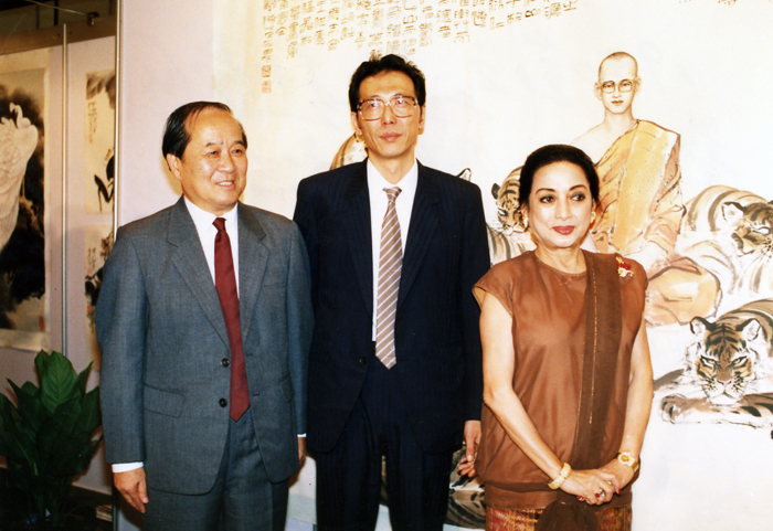 1990年应邀赴泰国举办个人画展,泰国总理察猜夫人坤仁文良和中国驻泰大使李世淳为画展开幕剪彩。