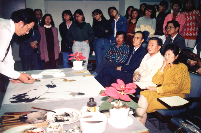 1991年应邀赴台讲学和举办个人画展。图为:应台湾成功大学邀请演讲和现场作画。