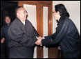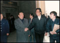 1987年,全国人大原副委员长班禅在画展上与石愚交谈。