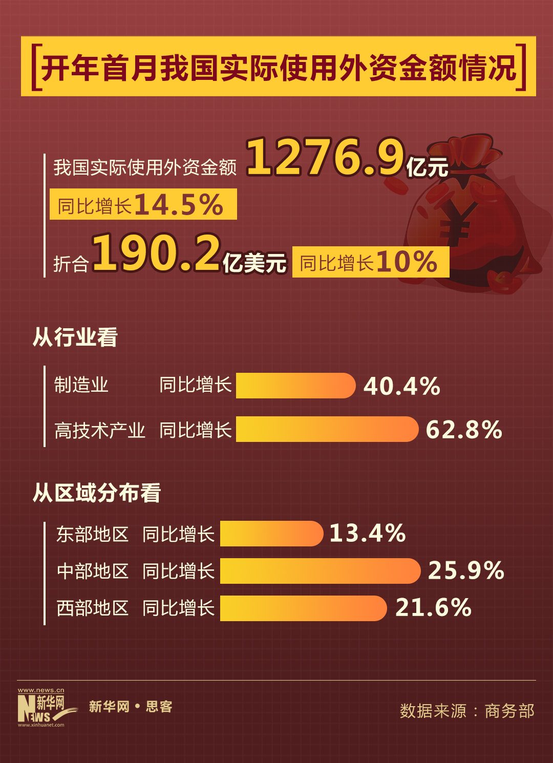 中国吸引外资规模再创历史新高。商务部近日发布数据显示,2023年开年首月我国实际使用外资金额1276.9亿元,同比增长14.5%。