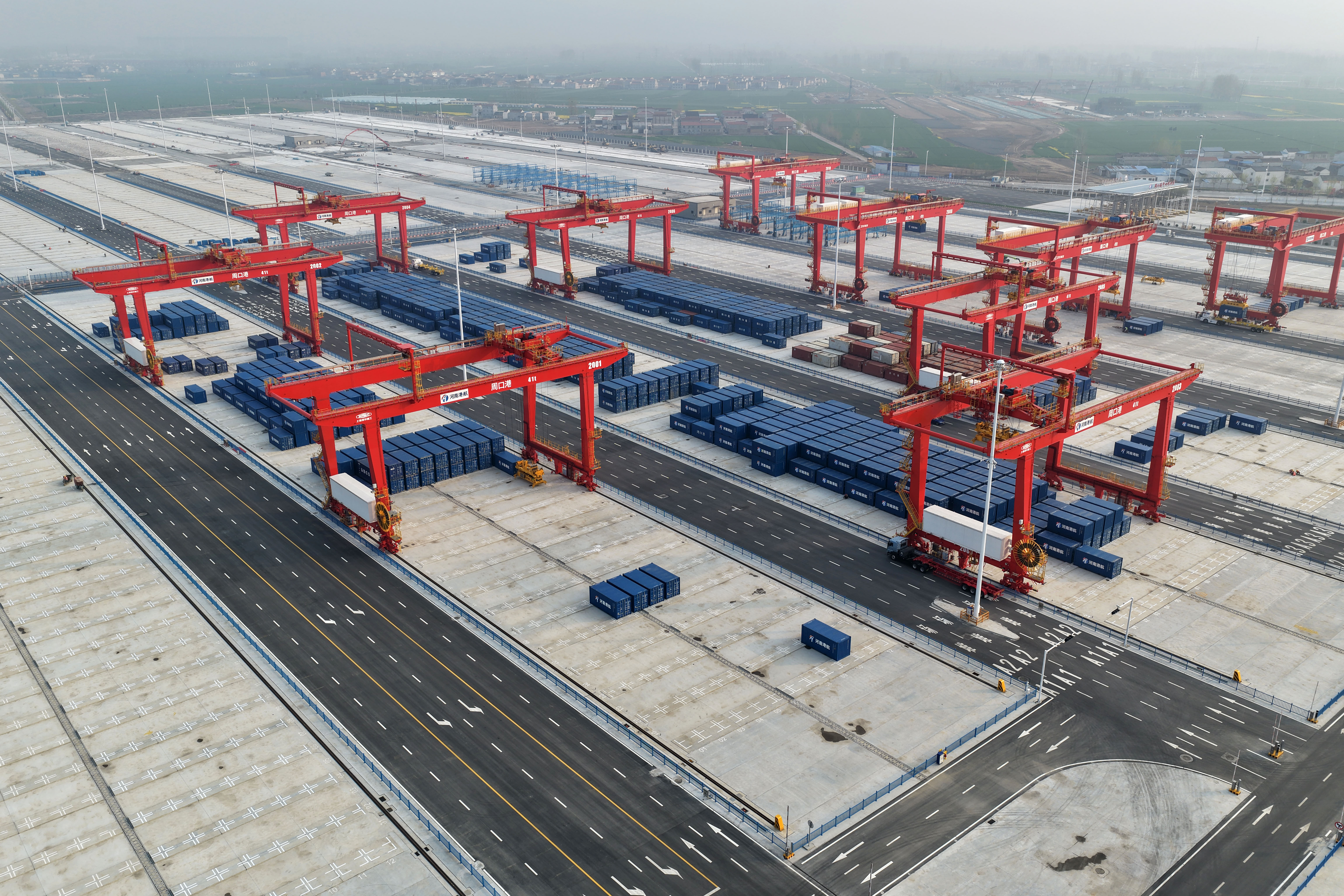 这是3月31日拍摄的周口港中心港区中心作业区堆场(无人机照片)。新华社记者 李嘉南 摄