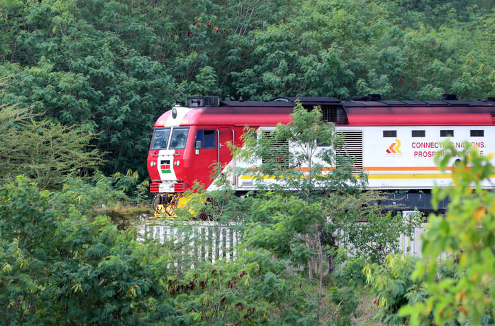 ↑7月27日,在肯尼亚蒙巴萨,一列货运列车行驶在蒙内铁路线上。新华社记者 董江辉 摄