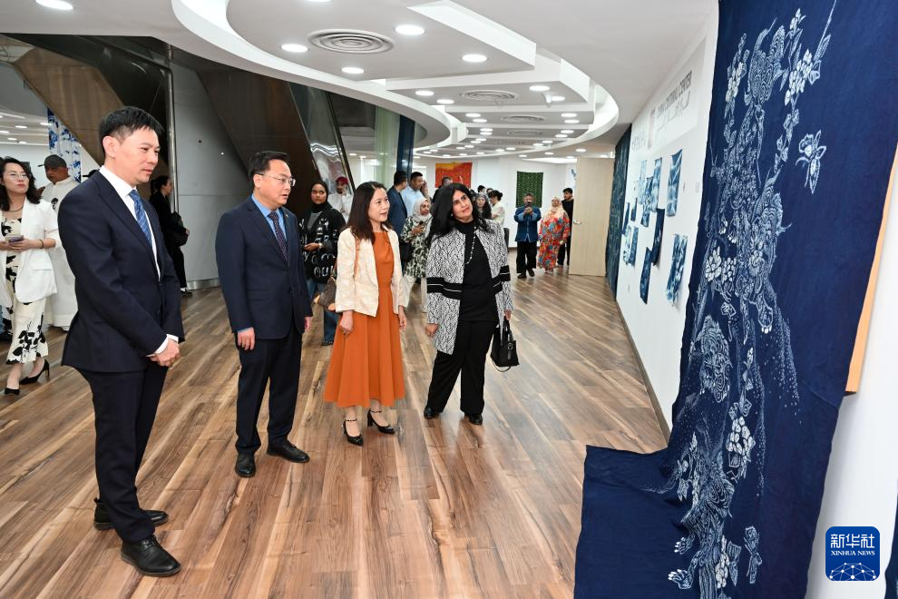 5月21日,在科威特哈瓦利省科威特中国文化中心,人们在“中国蓝染技艺暨茶和天下”中国非遗文化体验活动启动仪式上参观展览。新华社发(阿萨德摄)