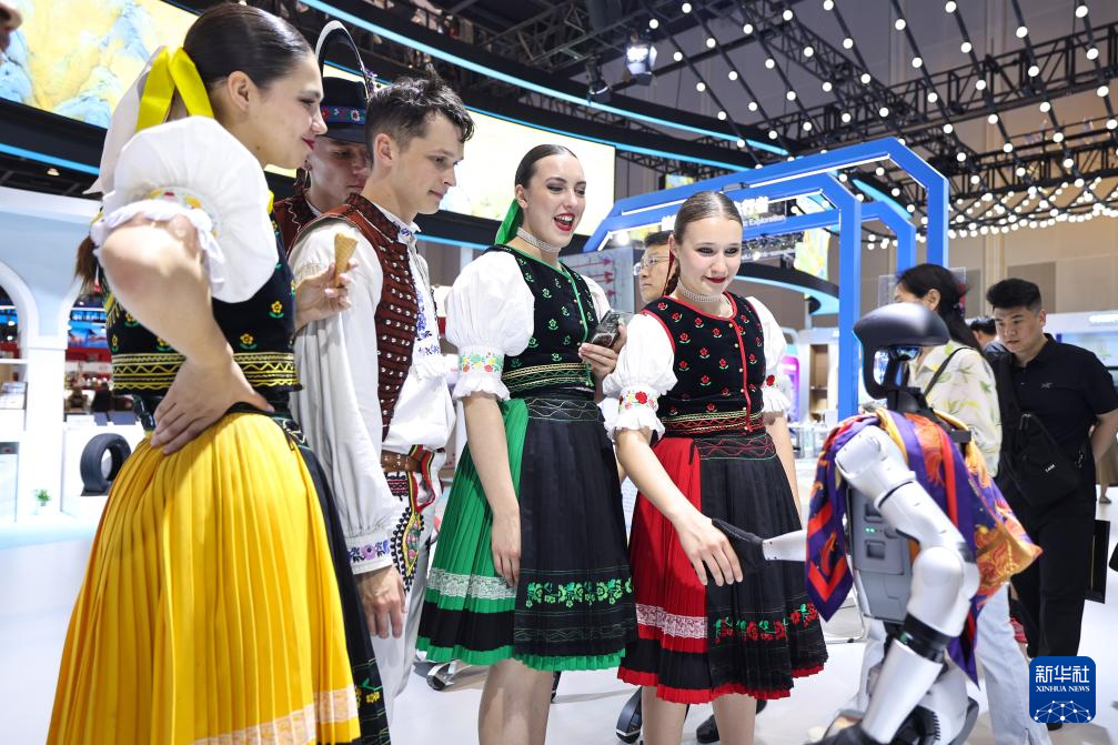 5月22日,外籍参会代表在第四届中国-中东欧国家博览会暨国际消费品博览会现场与人形机器人互动。