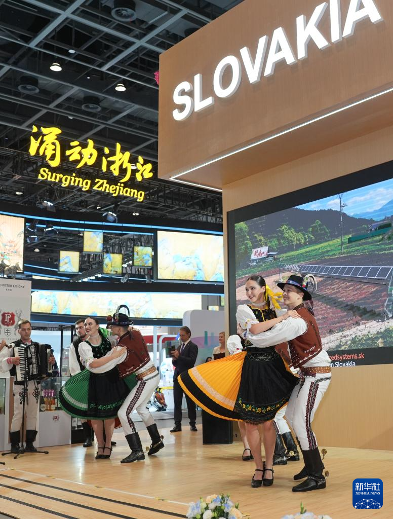 5月22日,来自斯洛伐克的表演者在中东欧展馆进行传统舞蹈表演。