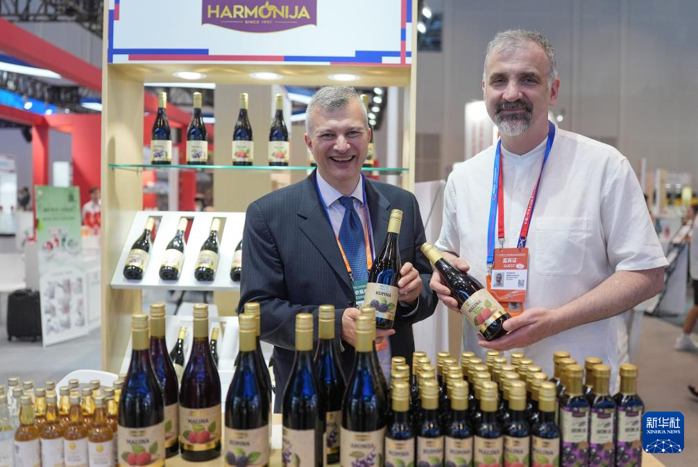 5月22日,塞尔维亚参展商在中东欧展馆推介果酒。