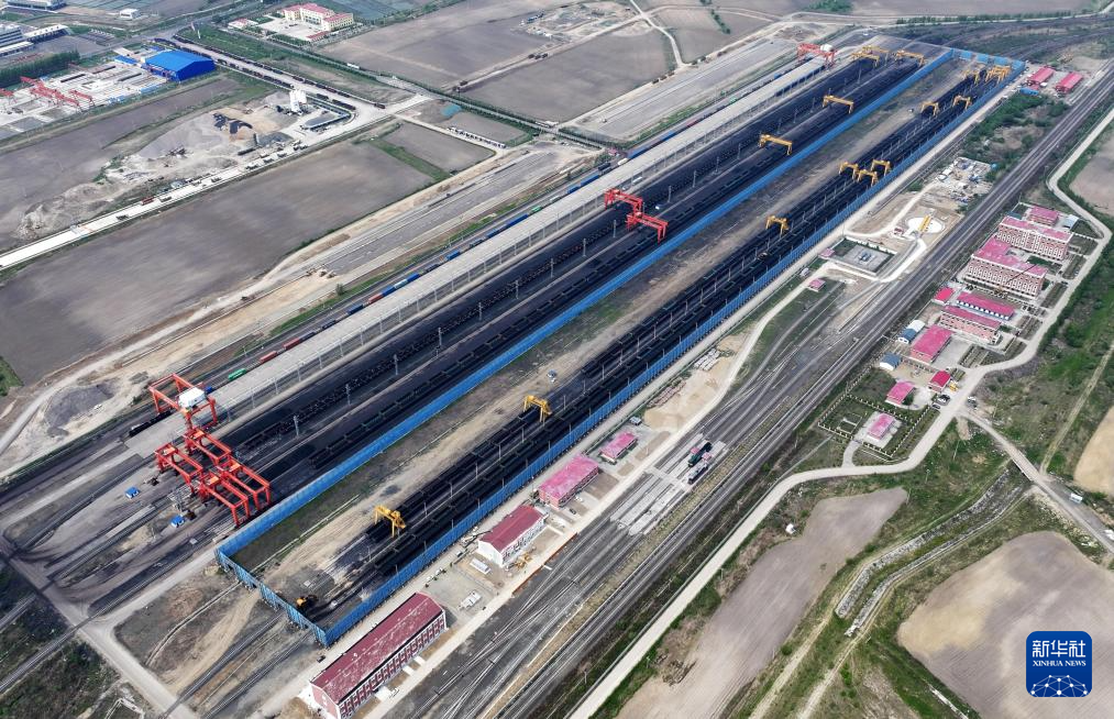 5月29日,黑龙江同江北站换装场内,一列中欧班列换装完毕(无人机照片)。