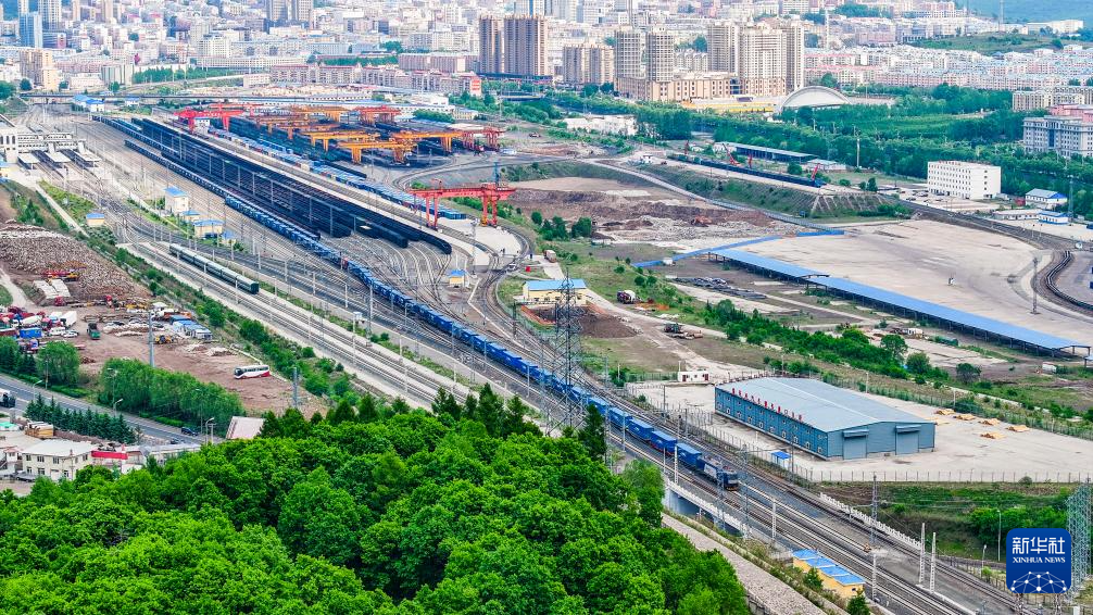 6月2日,一回程中欧班列从中国铁路哈尔滨局集团有限公司绥芬河站驶向山东方向(无人机照片)。
