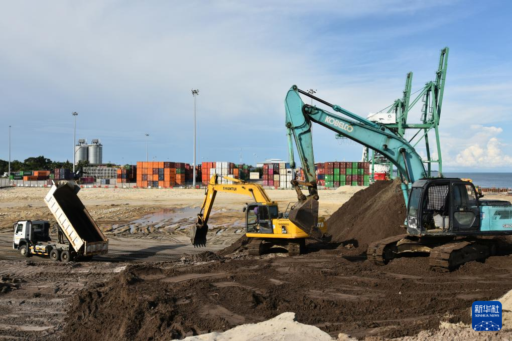 记者8日在施工现场看到,码头吹填区域新海岸线已初具雏形,各类机械装备正紧张有序地作业。巨大塔吊和层层叠叠的集装箱货柜与宽广碧蓝的海面相映衬,货轮在牵引船的引导下慢慢驶近。