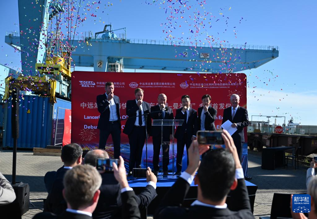 这是8月25日在比利时布鲁日的泽布吕赫港码头拍摄的“泽布吕赫-曼海姆”直达铁路班列首发仪式现场。新华社记者 吕优 摄