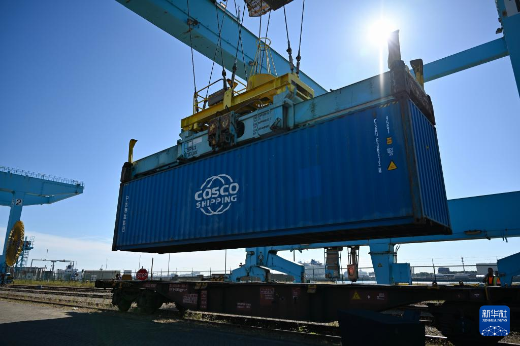 8月25日,在比利时布鲁日的泽布吕赫港码头,集装箱被装载到即将出发的首趟“泽布吕赫-曼海姆”直达铁路班列上。新华社记者 吕优 摄