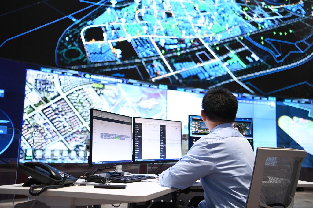 2024年9月27日,工作人员在中新天津生态城智慧城市运营中心内监控。新华社记者赵子硕摄
