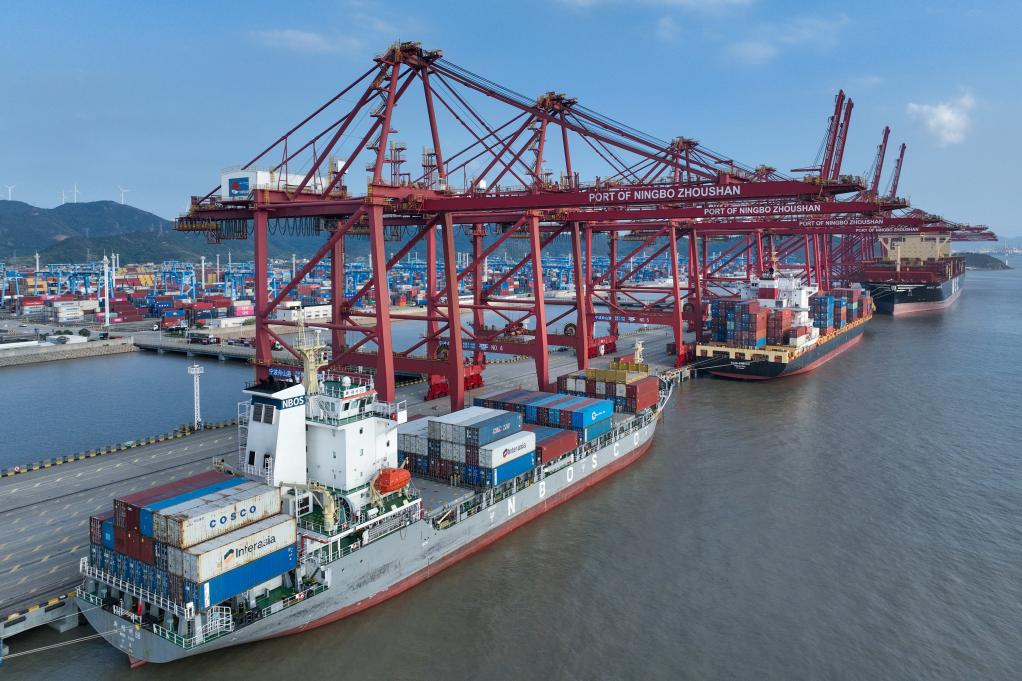 2025年10月13日,在宁波舟山港金塘港区大浦口集装箱码头,船舶进行集装箱装卸作业(无人机照片)。新华社发(邹训永摄)