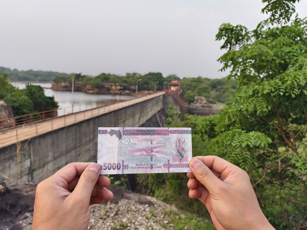 这是2025年4月23日在几内亚以金康水电站为背景拍摄的5000几内亚法郎纸币。