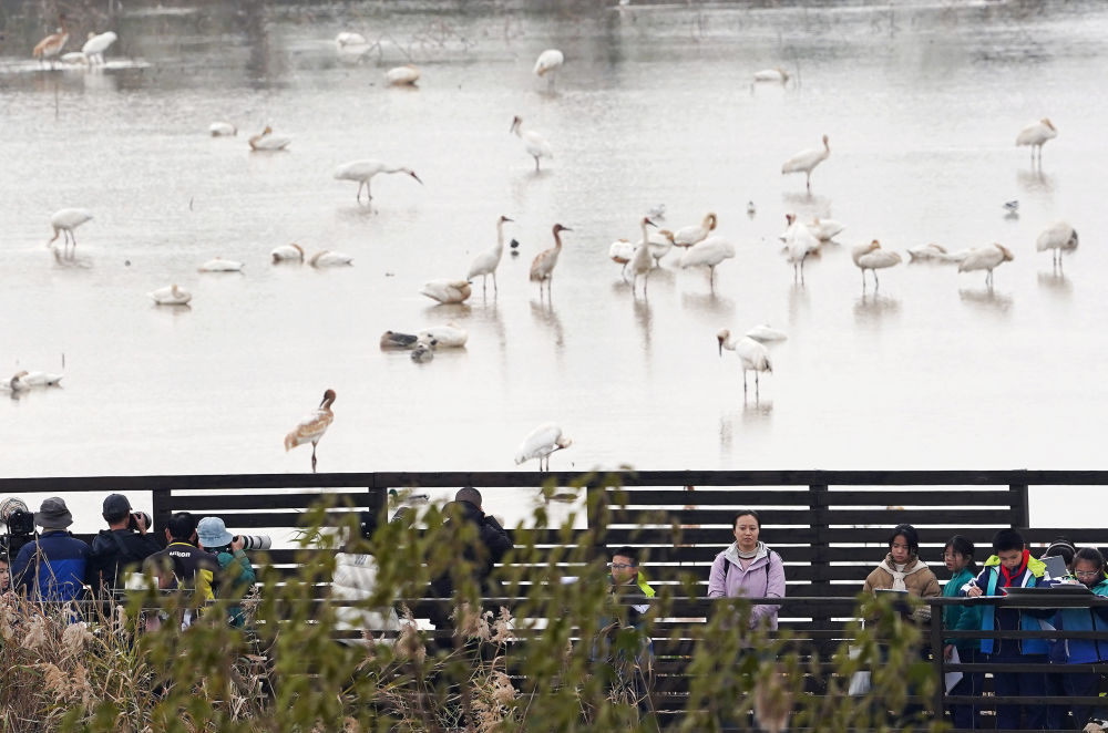 在鄱阳湖畔的江西省南昌市白鹤小镇,游客与学生们近距离观察野生白鹤(2024年12月17日摄)。