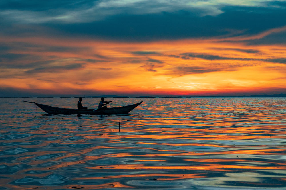 在肯尼亚基苏木,渔民于日落时分驾船在维多利亚湖上捕鱼(2026年2月27日摄)。