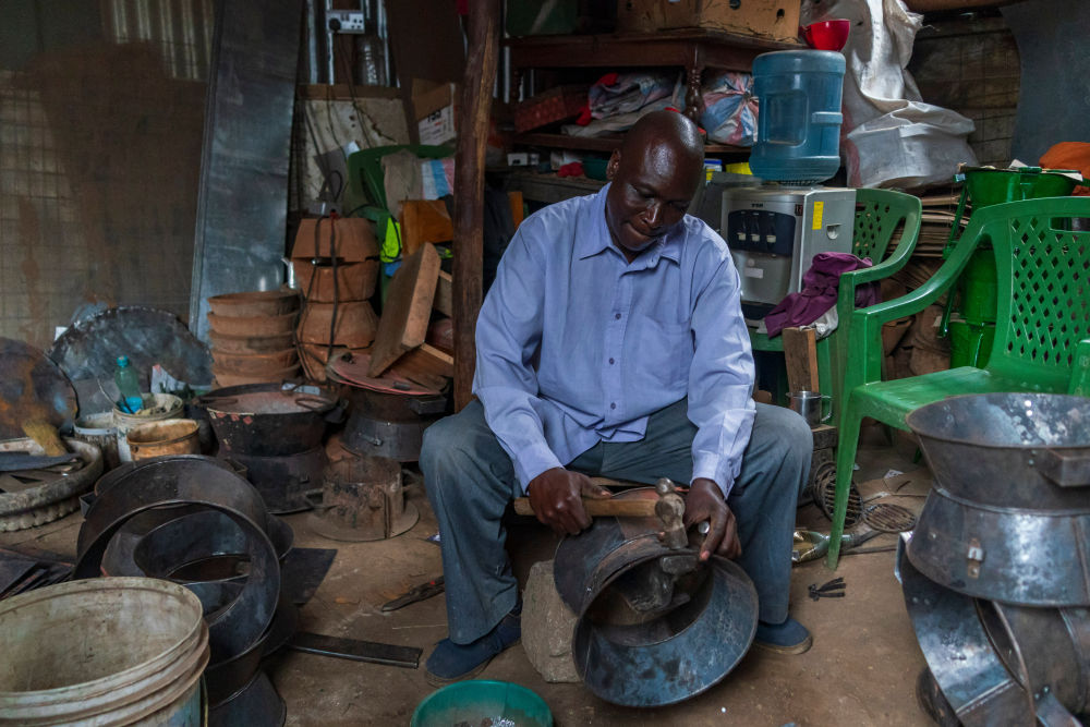 在维多利亚湖畔的肯尼亚基苏木,商家制作陶土炉灶的金属外壳(2026年2月28日摄)。这种清洁炉灶的制作原料取自非洲当地,工艺简单。