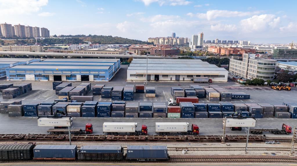 中老铁路国际货物列车在昆明市王家营西站进行装箱作业。新华社记者 胡超 摄