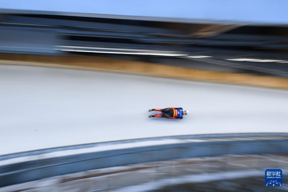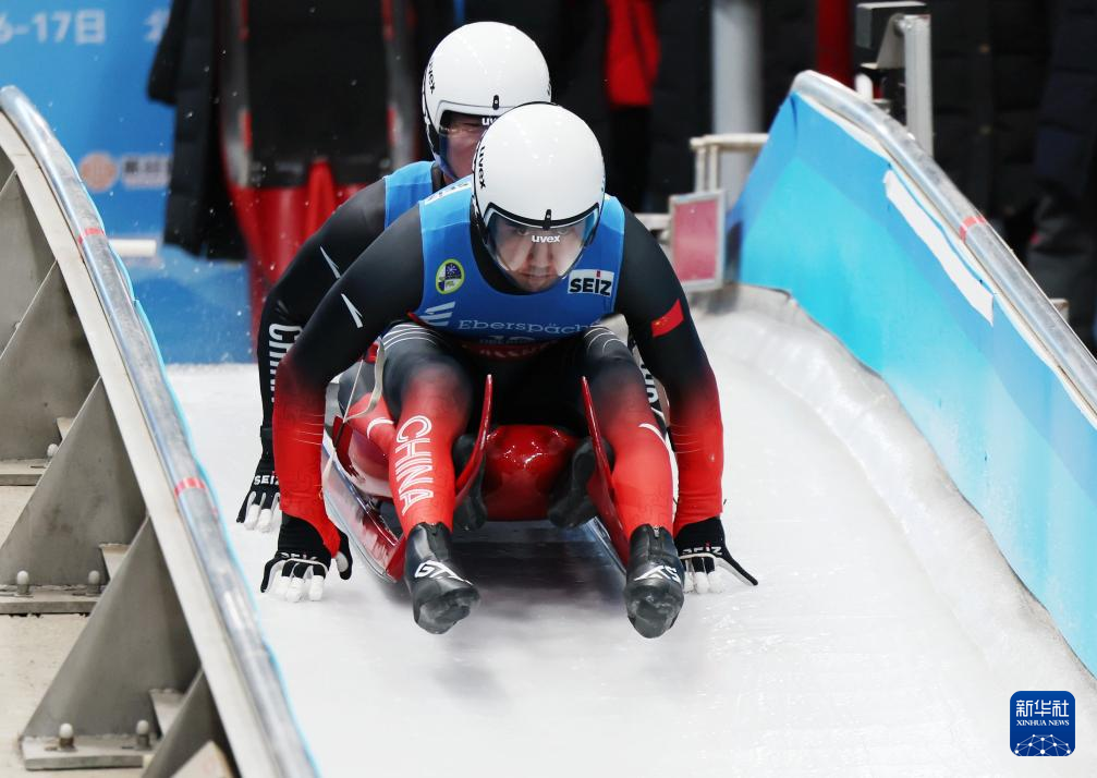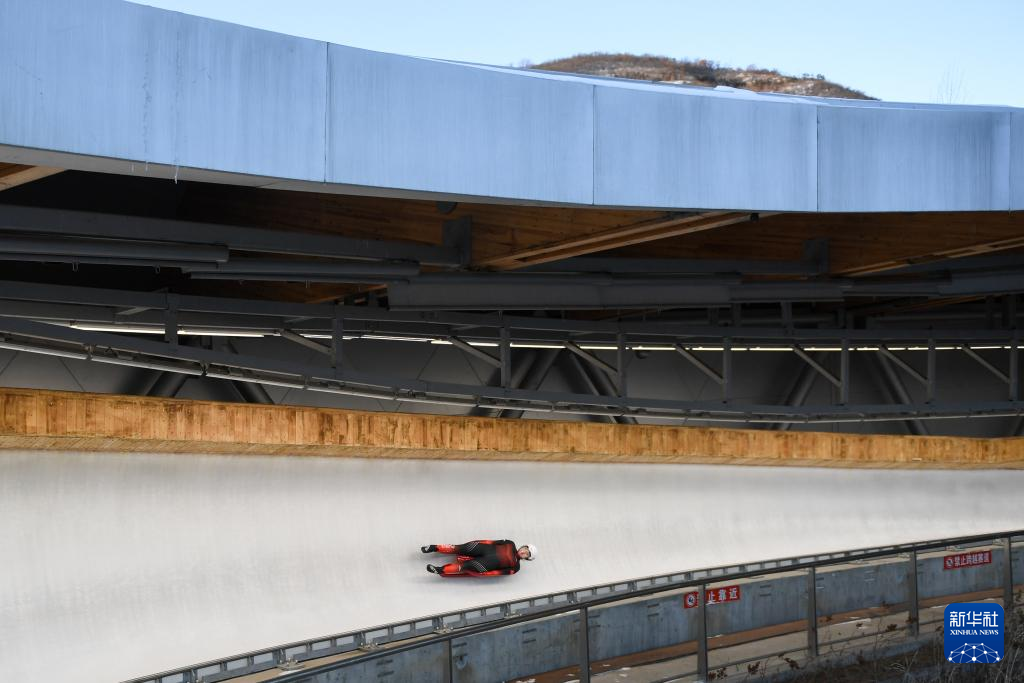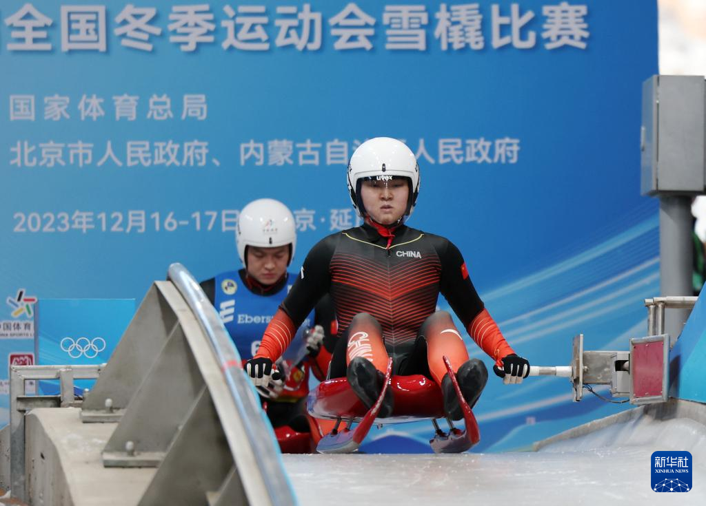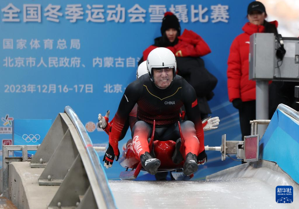 12月17日,黄叶波/彭俊越在比赛中出发。当日,第十四届全国冬季运动会团体接力雪橇项目比赛在国家雪车雪橇中心进行。新华社记者 张晨霖 摄